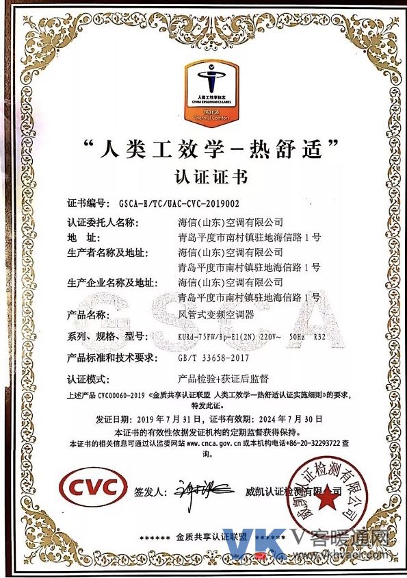 2019年8月,“金质共享认证联盟”在北京发布了第一批(25款)适合中国人的“人类工效学-热舒适”认证的好空调。其中,科龙中央空调“空气源