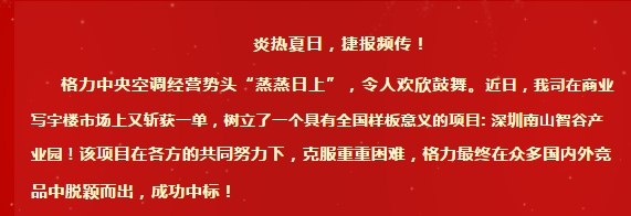 格力中央空调经营势头“蒸蒸日上”,令人欢欣鼓舞。近日,我司在商业写字楼市场上又斩获一单,树立了一个具有全国样板意义的项目: 深圳南