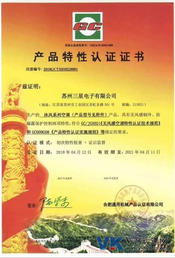 权威认证√ 三星沐风系列室内机荣获产品特性认证证书