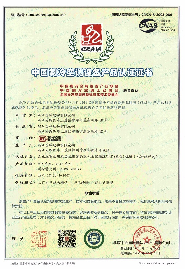 国祥水冷螺杆机组获得中国制冷空调设备产业联盟CRAIA认证产品