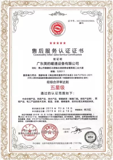 喜报丨美的中央空调荣获售后服务五星级认证证书