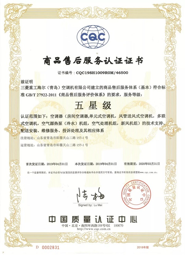 口碑印证,三菱重工海尔荣获商品售后服务质量五星级认证证书