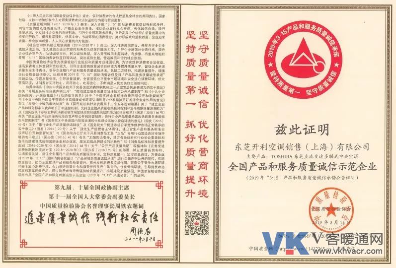 近日,东芝空调荣获由中国质量检验协会颁发的“2019年315全国产品和质量诚信示范企业”证书及“全国质量检验稳定合格产品”证书(2016年1月