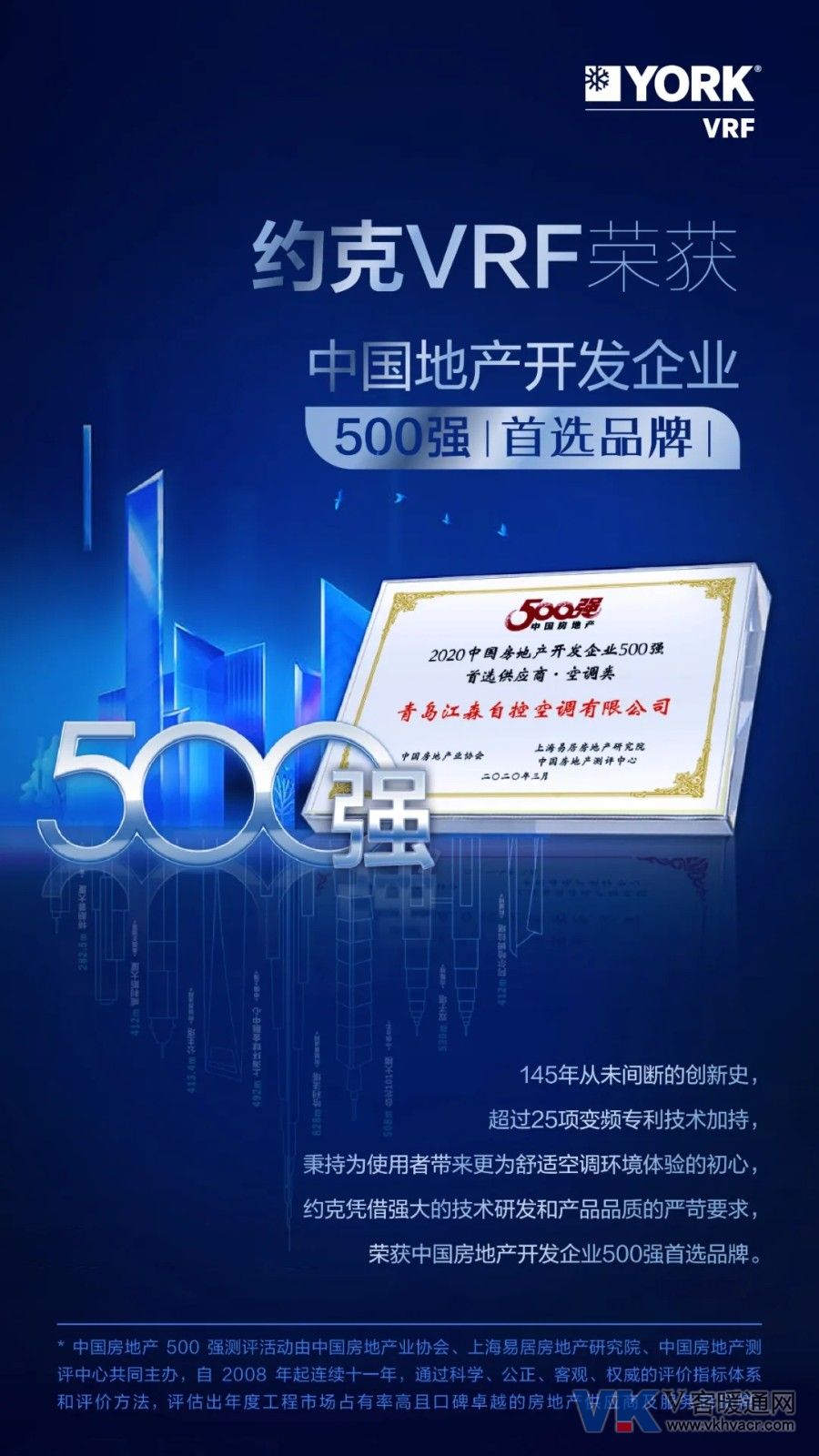 约克VRF荣膺“2020年中国房地产开发企业500强首选品牌(空调类)”