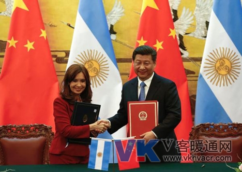 2015年2月4日,北京人民大会堂,阿根廷总统克里斯蒂娜(左)正与中国国家主席习近平握手。 中国装备“走出去”继续发力,相比已成气候