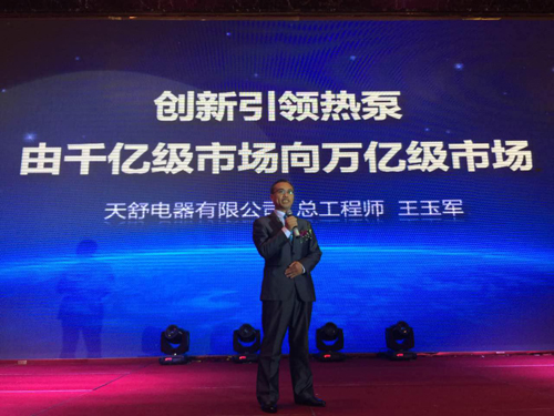 最后,天舒电器有限公司总工程师王玉军发表了《创新引领热泵——由千亿级市场向万亿级市场》的主题演讲,并向与会经销商们介绍了天舒的新产品。