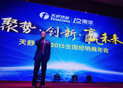 致辞过后,江苏天舒电器有限公司董事长王天舒进行了《聚势、创新、赢未来——天舒的现在与未来》为主题的精彩演讲。在演讲中,王天舒首先回顾了天舒从无到有的发展历程,并讲述了成立江苏天舒电器有限公司的初衷。在创办天舒之前,王天舒董事长已是中国厨卫家电十强代理商之一,太阳能行业备受推崇的“太阳能产品家电化”“太阳能销售乡镇连锁化”销售模式开创者,其相关营销模式被众多太阳能经销商奉为营销宝典。在他事业走向巅峰之时,他选择迈进充满更多挑战的热泵热水制作领域,决心自创品牌,将天舒推广到全国乃至全世界。