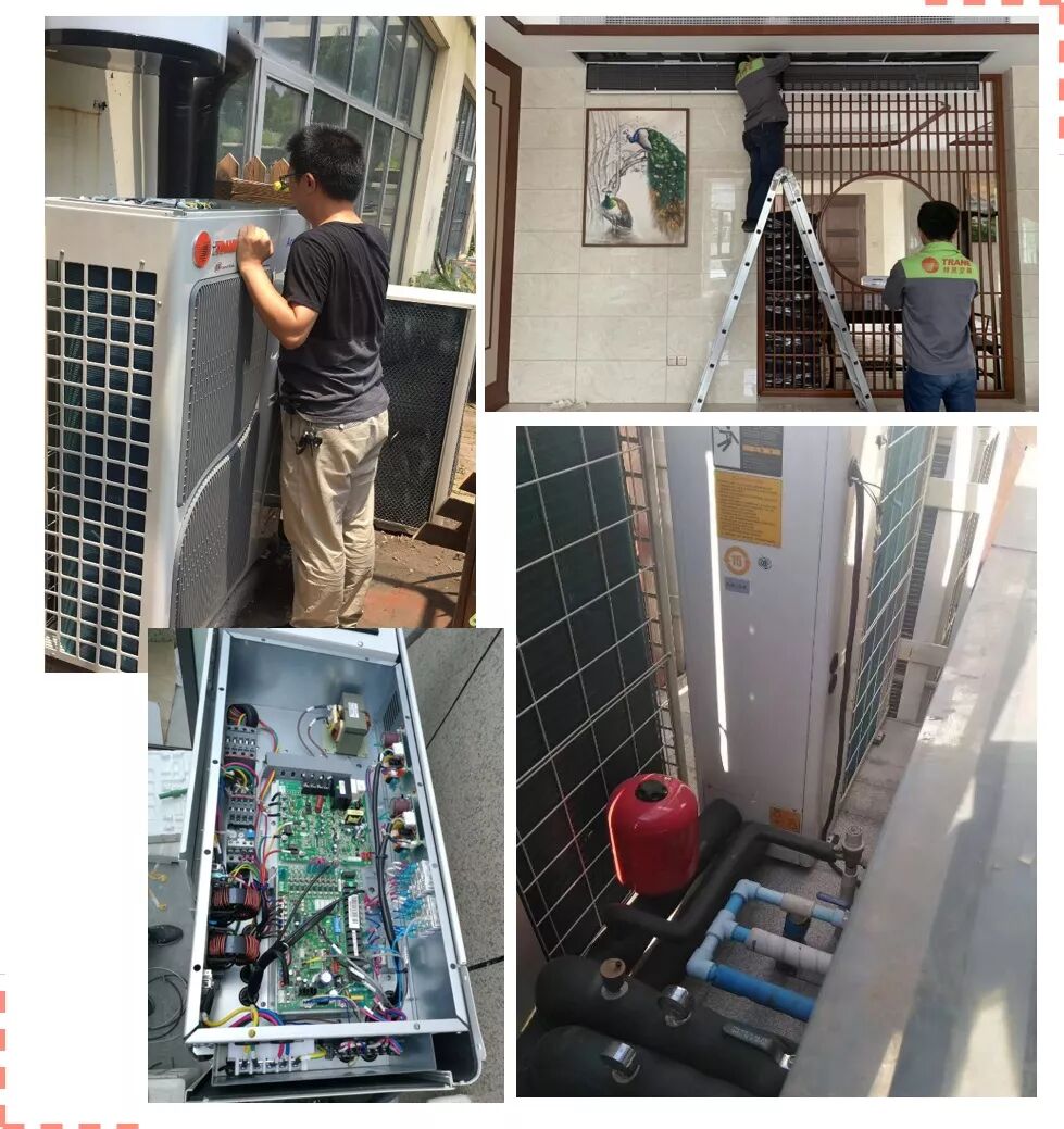 特灵户式水机(TraneHome) 系统连接示意图 特灵HFCS羽谧超薄卧式暗藏式内机: 超薄机组高度仅200mm,深度仅440mm更符合家装安装条件,积水盘内置空间释放,美观和实用性提高,从根本上杜绝室内机吊顶压抑的不适感;噪音更低,舒适度更高。 特灵AquaKool直流变频风冷冷水机组 (2015年上市),特灵全新变频主机做到水电分离,采用双转子压缩机,直流无刷风扇电机,六重降噪,双重除霜,出水水温控制,电子膨胀阀控制,压力水流开关,水力组件俱全。 机器节能高效,降低运行成本;声音更轻,水温控制更精确,除霜时间更短,舒适度远远提升;开放智能控制,轻松接入智能家居,创造现代化都市生活。 特灵设备进场安装施工 -设备堆放规范,风盘包有防尘罩。 -管道施工标注明确,安装工艺提高,安装现场整洁干净。 特灵WPWE/HWWD水地源热泵机组 安装施工 采用地埋管与地下水或土壤换热的形式,来达到室内冷热的需求,专业打井设备,80米打井深变,3-5米打井间距/口。系统运行不受外界气候影响,稳定性高,地埋管换热形式更节能,机组无需化霜,运行效率高,更环保,使用寿命长,业界的“小钢炮”。 特灵安装调试 特灵统一设备调试,拨打4008201363,由特灵售后专业人员到现场进行设备安装调试,不规范部分出具书面整改,达到特灵要求才进行开机系统运行,更确保了户式水机的稳定性,可靠性和节能性。特灵专业的设备,专业的人员,给用户带来专业的服务,消除用户对水机的顾虑, 提升特灵的品质。 致力于为每个家庭创造美好的舒适空间……